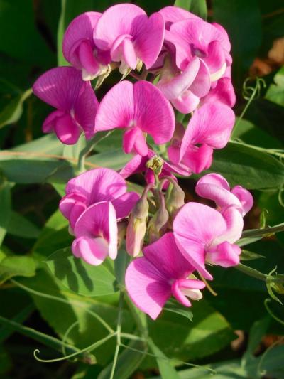 Climbing vine with purple flowers.